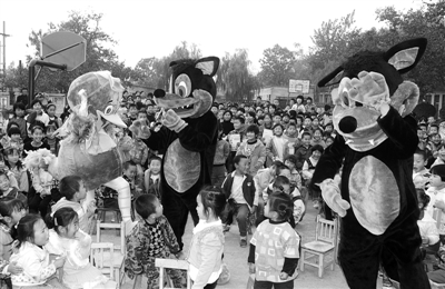 11月1日,河北省话剧院儿童剧团来到邢台县山区小学太子井完小,为这里的300多名学生演出儿童剧。今年5月,河北省委宣传部、河北省文明办、河北省文化厅启动“百场儿童剧进校园”活动。半年来,演职人员带着《白雪公主和七个小矮人》《三只小猪》等经典剧目,行程近万里,足迹遍及河北省35个市县。 新华社记者 巩志宏摄