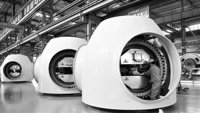 11月4日,在位于酒泉工业园区内东方电气(酒泉)新能源有限公司轮毂装配区,工人在查看下线的风机轮毂。去年园区新能源装备制造产值达201亿元,生产风电机组2017台,占全国当年风电机组产量的15.6%。 本报记者 李琛奇摄