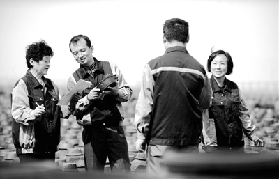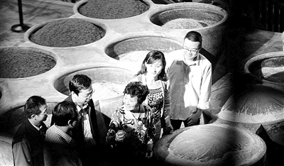 图① 叶荷生(左一)今年67岁,儿子沈智勇(左二)和儿媳李文清(右一)也都在厂里工作。食醋生产从手工作坊式向机械化、工业化大生产转型,这家人费了许多心思研究技改措施。