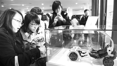 11月8日,参观者在观看由北京工业大学学生设计的、获一等奖的汽车模型作品《上班族》。 当日,2011中国汽车造型设计大赛获奖作品展在北京汽车博物馆拉开序幕。 新华社记者 张 旭摄