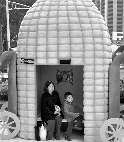 11月8日,市民坐在南京新街口的“玉米屋”中休息。这组卡通造型的“玉米屋”有提醒人们爱惜粮食的含义。 新华社发