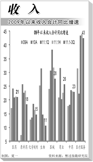 中国建银投资证券研究所对医药板块162家有可比数据的公司主要财务指标统计显示,各子行业增长状况有所不同,其中医疗服务板块表现突出。该板块收入和归属母公司利润分别增长52.51%和53.20%,扣除非经常损益后增长98.53%。其中爱尔眼科收入和利润增长幅度都在50%以上。