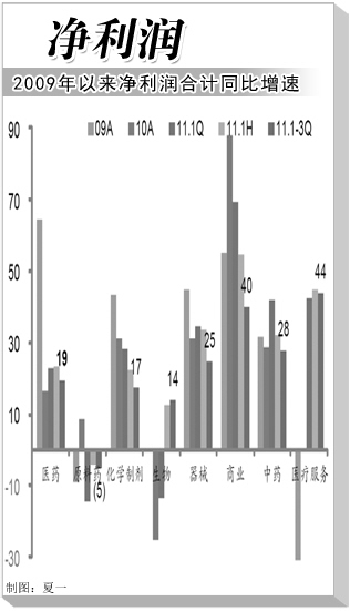从公司利润增长情况来看,前三季度归属于母公司的净利润同比增长超过30%的上市公司有63家,主要有以下几类:一是主营收入快速增长的公司。如中恒集团﹑尔康制药﹑易联众﹑双鹭药业﹑华海药业﹑汤臣倍健﹑新华医疗﹑鱼跃医疗﹑翰宇药业﹑爱尔眼科﹑东阿阿胶﹑贵州百灵等;二是投资收益及非经常性损益贡献利润的公司。如ST中源、青海明胶、英特集团、海南海药、ST东盛等。