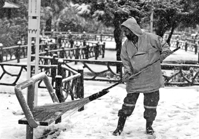 11月8日,德黑兰迎来今冬第一场雪。图为一名男子在伊朗首都德黑兰街头扫雪。 新华社发