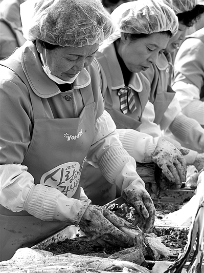 11月8日,大约2000名首尔市民聚集在首尔广场,现场制作12万株白菜泡菜,捐助贫困者。泡菜是韩国最不可或缺的食物,每到冬季来临,“泡菜王国”的民众都会举行大型捐赠泡菜活动,以帮助穷苦人民过冬。图为人们在首尔广场制作泡菜。 新华社发