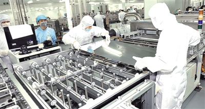 11月8日,工作人员进行硅基薄膜太阳能电池项目生产线的调试生产。当日,广东汉能硅基薄膜太阳能电池项目试产成功。据了解,这一项目投资额达210亿元,是目前广东最大的光伏项目。 黄赞福摄(新华社发)