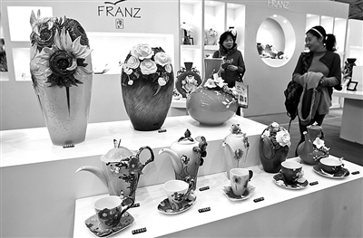 11月6日,在北京全国农业展览馆内,参观者在观看北京台湾名品博览会上展出的精品瓷器。 赵冰摄(新华社发)