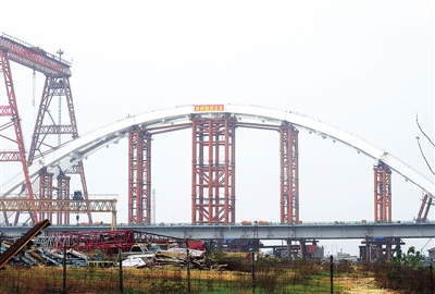 这是近日顺利合拱的长沙福元路湘江大桥首跨钢拱(11月10日摄)。据介绍,长沙福元路湘江大桥越江段约1435米。目前,大桥正加紧钢拱拼装,明年6月实现主桥合龙。 新华社记者 龙弘涛摄