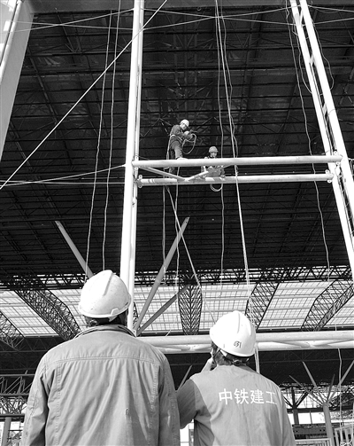 11月9日,工人在新郑州火车站进行幕墙焊接作业。 目前,位于郑州郑东新区的新郑州火车站进入最后的装修阶段。新火车站总建筑面积为41.2万平方米,共设站台16座,预计将在2012年1月底全部完工。 李床博摄 (新华社发)