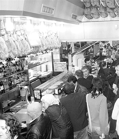 马德里火腿博物馆里挤满了参观者和食客。 本报记者 徐 涵摄