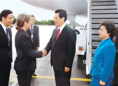 11月10日,国家主席胡锦涛乘专机抵达美国檀香山,出席亚太经济合作组织第十九次领导人非正式会议。这是胡锦涛主席和夫人刘永清在机场受到美国国务院高级官员的热情迎接。 新华社记者 鞠 鹏摄