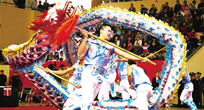 11月12日,一只参赛队伍在进行舞龙表演。当日,2011年全国龙狮精英赛在南京举行,吸引众多南京市民前来观赏。王 新摄(新华社发)