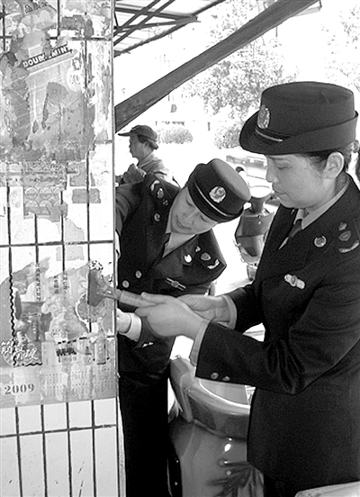 浙江省长兴县工商、城管等部门联合组织清理城市“牛皮癣”小广告活动。 丁青青摄
