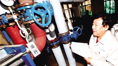 翻开下一层防护箅子,井下一片漆黑,在强光手电的照射下,只见向下攀扶的爬梯覆着泥水和锈迹。这是一个15平方米左右的地下空间,距离地面约4米,闷热且潮湿。几条粗粗的主管线,最外层由厚厚的保温层包裹,远处则是延伸的管线和固定支架。“管道上标有红色箭头的代表供水,也就是从电厂过来的一次水,它将进入各个热力站。”栾为民作了简短说明。随后,他和生产组长周辛手持强光手电,开始检查管线的设备附件等关键部位,光柱顺着管线逐行慢慢扫过,在管线交会处反复查照。小室里,不时听到“哐咚、哐咚”的闷响声。“那是外面路上汽车轮子压过井盖的声音。”栾为民说,其实每个小室至少会有两个接地口,有时为了减小对路面交通的影响,在条件允许的情况下,检查时只开启一个,通风不够好。