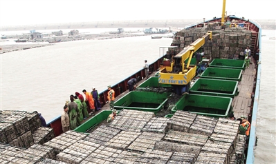 11月15日,在福建省莆田市石城渔港码头,当地边防官兵和渔民将船上的鲍鱼网箱转移到渔排上养殖。 为避免北方天气转冷对鲍鱼养殖造成影响,在山东省荣成市养殖的2500多万粒鲍鱼被陆续转运至福建省莆田市石城海域“过冬”。 林剑冰摄 (新华社发)