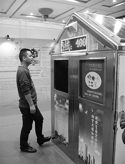 图1:浙江台州鑫佳园环保设备有限公司展示的生态垃圾房,具有人体感应语音提示功能。