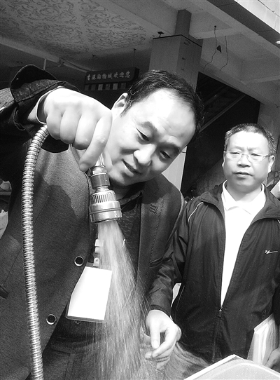 图2:重庆鼎上科技有限公司负责人范广平正在专利周展示现场讲解花洒原理,展示防堵节水花洒效果。
