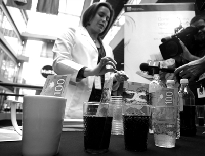 11月14日,在加拿大多伦多举行的新闻发布会上,一位技术人员(左)展示新发行的100加元塑料钞票的耐用性。 当日,加拿大央行宣布首次开始发行塑料钞票。这次进入流通的塑料钞票面值为100加元,以特别聚合物制成,具有易辨识、难假造等特点,预计使用寿命是普通纸币的2.5倍。加拿大央行还表示,其他面值分别为50元、20元、10元及5元的塑料钞票将在2013年年底前陆续投入流