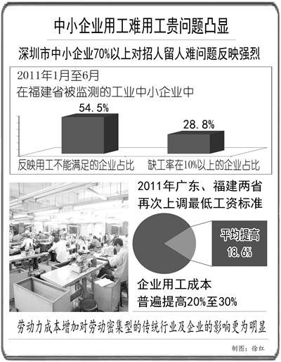劳动力短缺对劳动力密集型产业的影响尤为明显。在福建长乐的针织印染基地,当地中小企业主无一例外喊起“招工难”。随着当地产业规模的扩大,本地熟练织工一般干了几年都独立开家庭作坊,一线工人大都依靠外来人口。以长乐松下镇垅下村为例,本村人口约4000人,外来人口约3000多人,几乎全部是纺织工人。为了挽留熟练工人,企业竞相提高工人待遇,造成了一定的成本压力。长乐一线职工的月工资从前两年的2000元提高到5000元,还要包吃住。长乐正隆纺织股份有限公司总经理陈枫表示,今年每月员工的开支要比往年多约200万元,而目前企业月亏损达500万元,估计这样的困境还得“熬”半年。