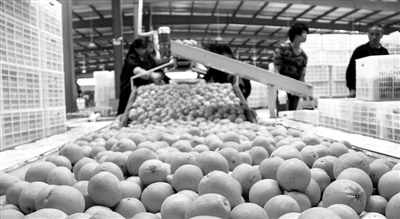 11月10日,位于江西省赣州市赣县江口镇的赣州天源果业有限公司分级加工车间,工人们在生产线上忙碌着。今年赣南200万亩脐橙喜获丰收,预计总产量突破110万吨。当前已进入脐橙采摘上市旺季,各加工企业正开足马力加快生产。 本报记者 赖永峰 通讯员 朱建华摄影报道