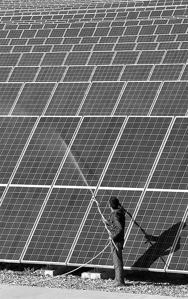 11月15日,华电嘉峪关光伏发电场,工作人员在清洗太阳能板。该项目一期10兆瓦已建成并网发电。未来几年,嘉峪关市将形成光电、风电和火电互相配套、互为补充的新能源发展格局。 本报记者 李琛奇摄
