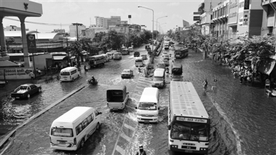 11月8日,在泰国首都曼谷,车辆在洪水中行进。泰国内政部防灾减灾厅8日公布的数据显示,这场持续3个月的洪灾已造成527人死亡,2人失踪。全国仍有24个府面临洪水威胁,290万人受灾。