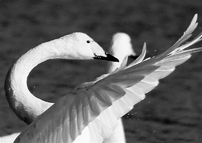 11月13日,一只天鹅在山西平陆黄河湿地振翅。 入冬以来,成群的白天鹅飞临山西平陆黄河湿地栖息越冬,吸引众多游人和摄影爱好者前来观赏、拍摄。 薛 俊摄(新华社发)