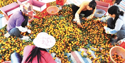 压题照片 11月16日,广西柳城县马山乡横山村横山屯,果农将新鲜的蜜橘装箱,准备发往外地。柳城县通过产业结构调整,蜜橘种植面积达15万亩,仅采摘、分装水果,就将给当地农民带来约5000万元的收入。 新华社记者 李 斌摄