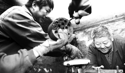 图① 11月17日,北京金泰集团有限公司西城区分公司油坊煤炭经营部,干这行已30年的迟广东(右)正在称蜂窝煤重量。