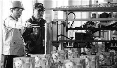 11月24日,电力工作人员(左)在浙江温州一家啤酒企业生产车间内对操作工人进行机器用电指导。针对冬季的供用电形势,浙江温州瓯海供电分局主动走进企业,积极了解企业用电服务需求,通过梳理企业的用电状况,向企业提供用电技术和服务咨询,指导企业制定用电优化方案,有效保障企业在冬季的生产用电。 杨 乐摄 (新华社发)
