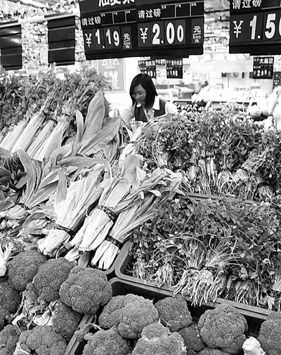 市民在山东聊城一个大商场内的蔬菜柜台选购蔬菜。据新华社全国农副产品和农资价格行情系统监测,近日全国蔬菜整体价格出现止降企稳迹象。张宪举摄(新华社发)
