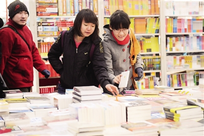 11月25日,读者在北京地坛公园的书市上挑选图书。