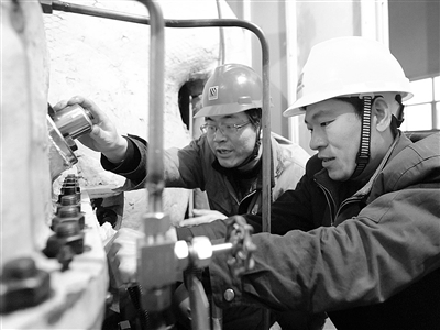 11月26日,山东省临沂市蒙阴德信鑫源热电有限公司汽轮机房,工作人员观测汽轮机运行状态。该公司加大节能改造力度,对老旧蒸汽管网进行设备改造,扩大供热能力,改善了当地居民的供暖环境。 本报记者 赵 晶摄
