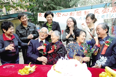 青山区九街居委会的工作人员为社区里多对金婚老人举办集体庆祝会,老人们觉得生活是越过越安逸了。对于青山区由工业老区向绿色循环经济区转型所带来的变化,老人们历历在目,更是由衷称赞。