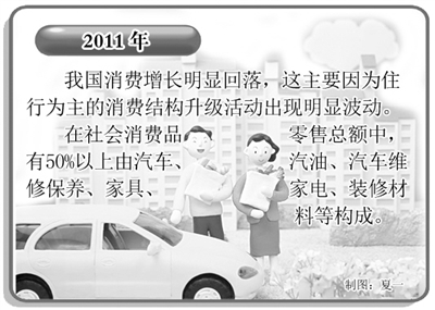 2011年,我国消费增长出现明显回落,1至9月份按可比价计算的社会消费品零售总额同比增长率回落了3.9个百分点。主要原因是住行为主的消费结构升级活动出现明显波动。1至9月份汽车销售额同比增长率回落20个百分点以上;买房需求降温使家具、家电销售额同比增长率回落10个百分点左右。买车买房需求的回调有必然性,尤其对控制房地产泡沫化趋势非常必要。但同时也要认识到,我国住行为主的消费结构升级还有较大的不稳定性。积极扩大消费,巩固内需增长基础,首先要解决住行需求增长不稳定的问题,把消费结构升级尽快引入平稳可持续的轨道。