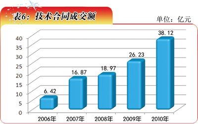 2010年,福建省技术市场各类技术合同成交总数达5137项,各类技术合同成交额达38.12亿元(表6)。