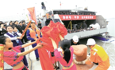 上午10点整,巨大的“海峡号”客滚轮在平潭澳前码头解缆起航,搭载首批507名旅客驶向台中港。据介绍,平潭-台中直航航线约88海里,单程航行2小时30分,平潭-台中航线是目前大陆到台湾本岛海上运行时间最短的航线。航线开通初期计划每月开通往返8个班次航班。