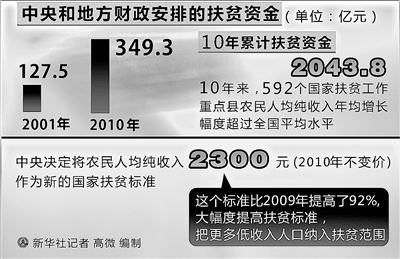 11月29日,中央扶贫开发工作会议宣布,中央决定将农民人均纯收入2300元(2010年不变价)作为新的国家扶贫标准,这个标准比2009年提高了92%。自此,“我国偏低的扶贫标准是否会提高”这个社会各界关注的热点话题有了定论。