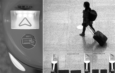 11月29日在高铁上海虹桥站拍摄的可刷二代身份证进站的闸机(拼版图片)。 12月1日起,旅客在网上购买沪宁、沪杭高铁车票后,可直接刷二代身份证检票上车,免去到车站取票的麻烦。 钮一新摄(新华社发)