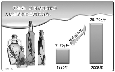 近年来,我国油料作物发展也很快,但仍然跟不上食用植物油需求量增长的速度。根据农业部的统计资料,1990年,全国大豆、花生、油菜籽、棉花籽、葵花籽、亚麻籽、芝麻、油茶籽八大油料作物合计产量为3452万吨,到2009年,八大油料作物产量提高到6015万吨。其中,很大一部分大豆、花生、葵花籽、芝麻被食用了,真正用于榨油的只有4500多万吨,榨出的油只有1100多万吨,而我国每年食用油的消耗量在2500万吨左右,食用油的自给率不足40%。
