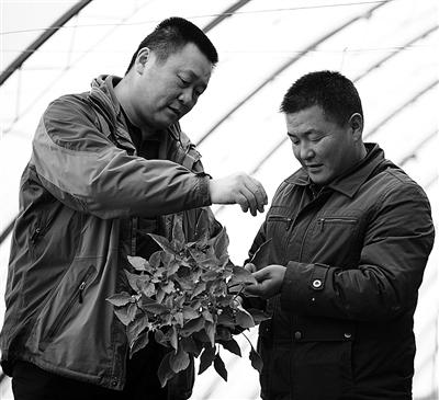 在新疆布尔津县设施农业示范园区蔬菜大棚内,县农业局副局长魏成武(左)在了解蔬菜长势。该县大力发展设施农业,目前,近70座的日光温室深冬生产型大棚里的蔬菜长势喜人,有望新年上市,缓解居民冬季购买蔬菜难的问题。 新华社记者 沙达提摄