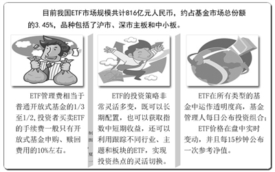 截至2010年底,全球各大交易所上市的ETF总数已达2480只,资产总规模超过1.3万亿美元。近年来我国ETF市场规模和影响稳步扩大,目前市场规模共计816亿元,约占基金市场总份额的3.45%,基本覆盖了所有一级行业,并且品种包括了沪市深市主板和中小板。