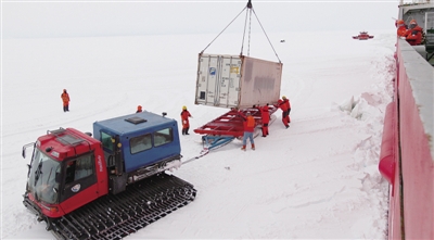 12月1日,一个集装箱从“雪龙”号科考船上被缓缓吊放至冰面的雪地车上。12月1日凌晨,第28次南极科考队海冰卸货工作正式启动。此次科考队中山站卸货任务包括昆仑站全部物资卸运,中山站后勤保障物资、科考设备等物资卸运,预计半个月内完成。 新华社记者 黄小希摄