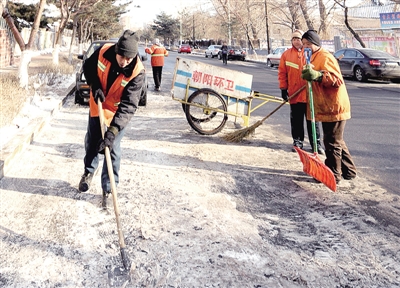 12月5日,长春市朝阳区环卫工人在清扫积雪。当日,长春市加强清扫道路积雪的力量,以保证行人和车辆的交通安全。11月26日始,吉林省中南部和东部普遍出现降雪。12月6日开始,吉林省还将普遍出现大雪降温天气。 新华社记者 林 宏摄