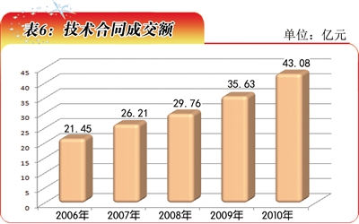 2010年,甘肃技术市场各类技术合同成交总数达2503项,各类技术合同成交额达43.08亿元(表6)。