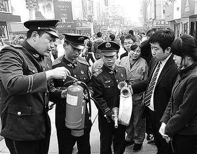 青岛市北公安消防大队派驻防消联勤巡查服务队,对台东商业步行街企业单位进行火灾隐患排查和宣传消防安全知识。 本报记者 刘 成 通讯员 李豹松摄影报道