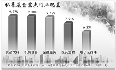 据对阳光私募仓位配置行业分布的统计,截至12月6日,食品饮料、机械设备、金融服务、医药生物和电子元器件等为私募重仓的几个行业,占比分别为9.37%、9.30%、9.12%、7.91%和6.23%。业内人士分析认为,这表明私募对“抗通胀”的关注在持续转向前期超跌的板块,而进入11月下半月后,市场面的消极因素则推动私募资金流向防御性行业。