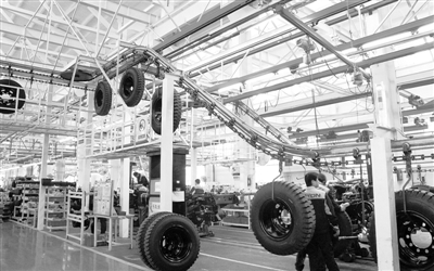 北汽福田汽车长沙汽车厂总装车间,工人在组装汽车零部件。前10月该厂产销汽车6.5万台,产品转型初现成效,中重卡的比重由2010年的8%上升至目前的25%,实现销售收入43亿元。 本报记者 周颖一摄