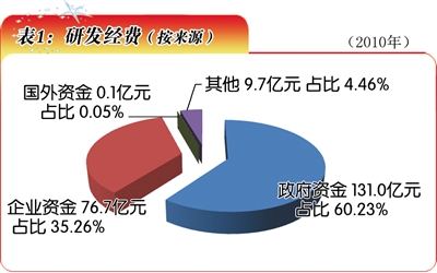 “十一五”时期,陕西全社会研发经费逐年增长。2006年该项支出为101.4亿元,2010年增至217.5亿元,占地区生产总值的比重为2.15%,高于1.75%的全国平均水平(表1)。