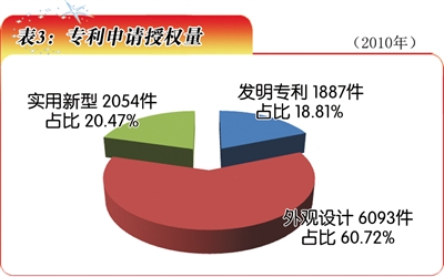 “十一五”时期,陕西专利授权量达2.64万件,是“十五”时期的3.15倍。2010年专利授权量达10034件(表3),并获得国家科技奖励30项。